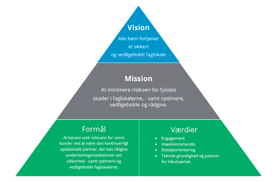 Vores vision er at være førende inden for sikkerhed og vedligeholdelse af faglokaler, og sikre, at alle skoler har trygge og sikre læringsmiljøer.”