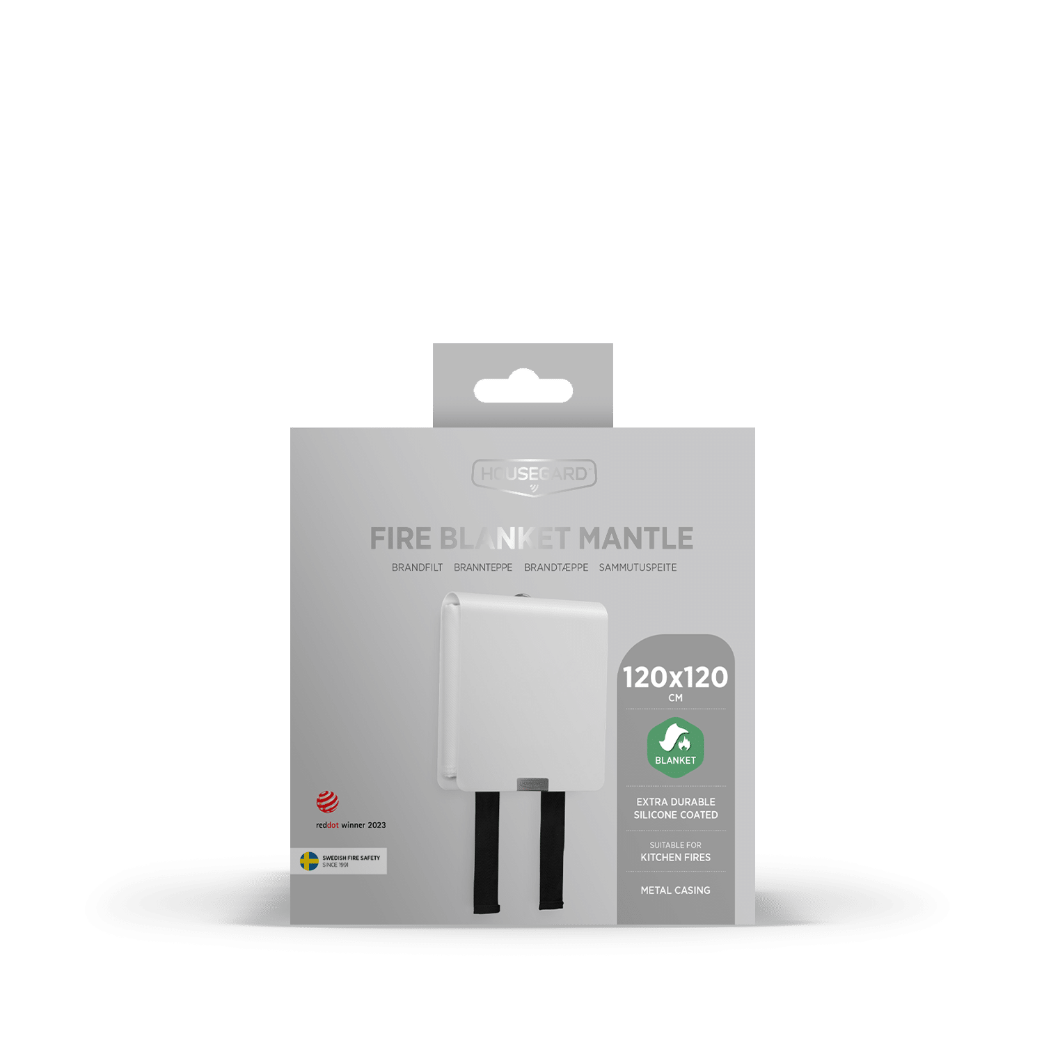 Brandtæppet leveres i en luksuriøs emballage, hvor yderhylsteret kan fjernes og anvendes som gaveæske. Røde etiketter med brugeroplysninger på nordiske sprog medfølger. Produktet leveres med 5 års garanti.