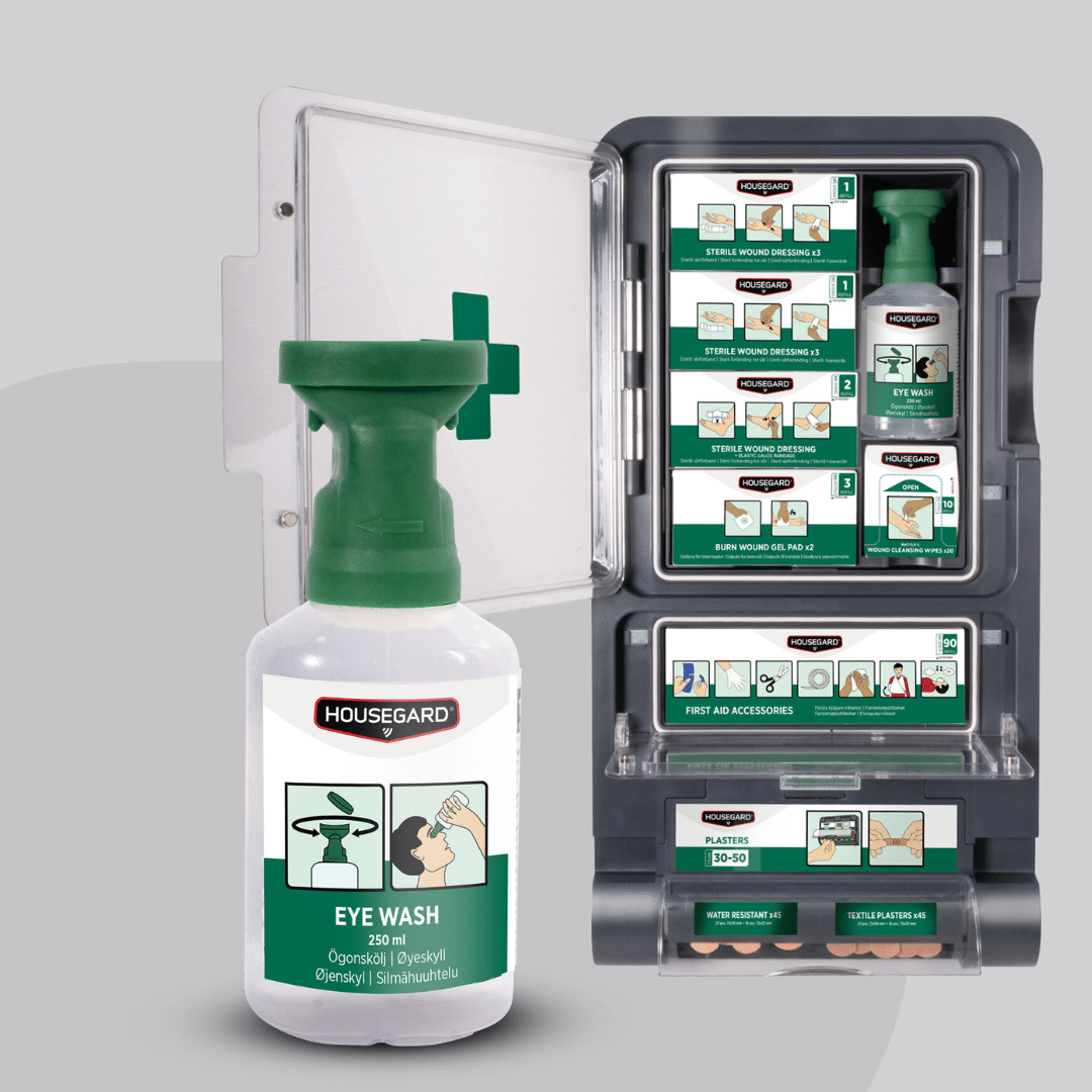 Førstehjælpsstation med udstyr til sårbehandling og øjenskyl, designet til arbejdspladser med fokus på overblik og effektiv første indsats. Stationen har tydeligt placerede refills, synlig datomærkning og kan genopfyldes uden værktøj, hvilket gør vedligeholdelsen enkel. Førstehjælpsstation