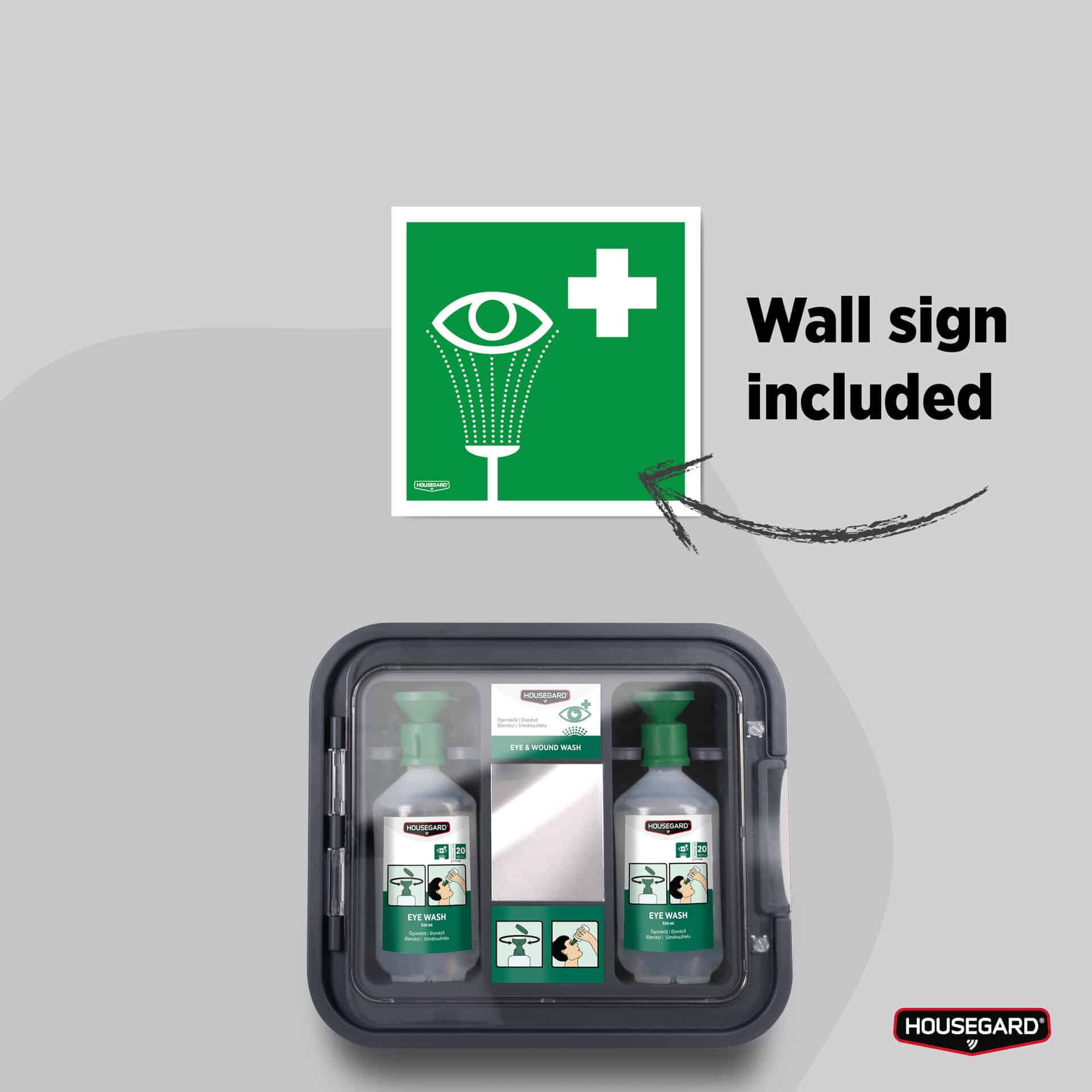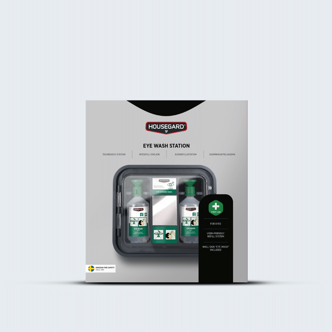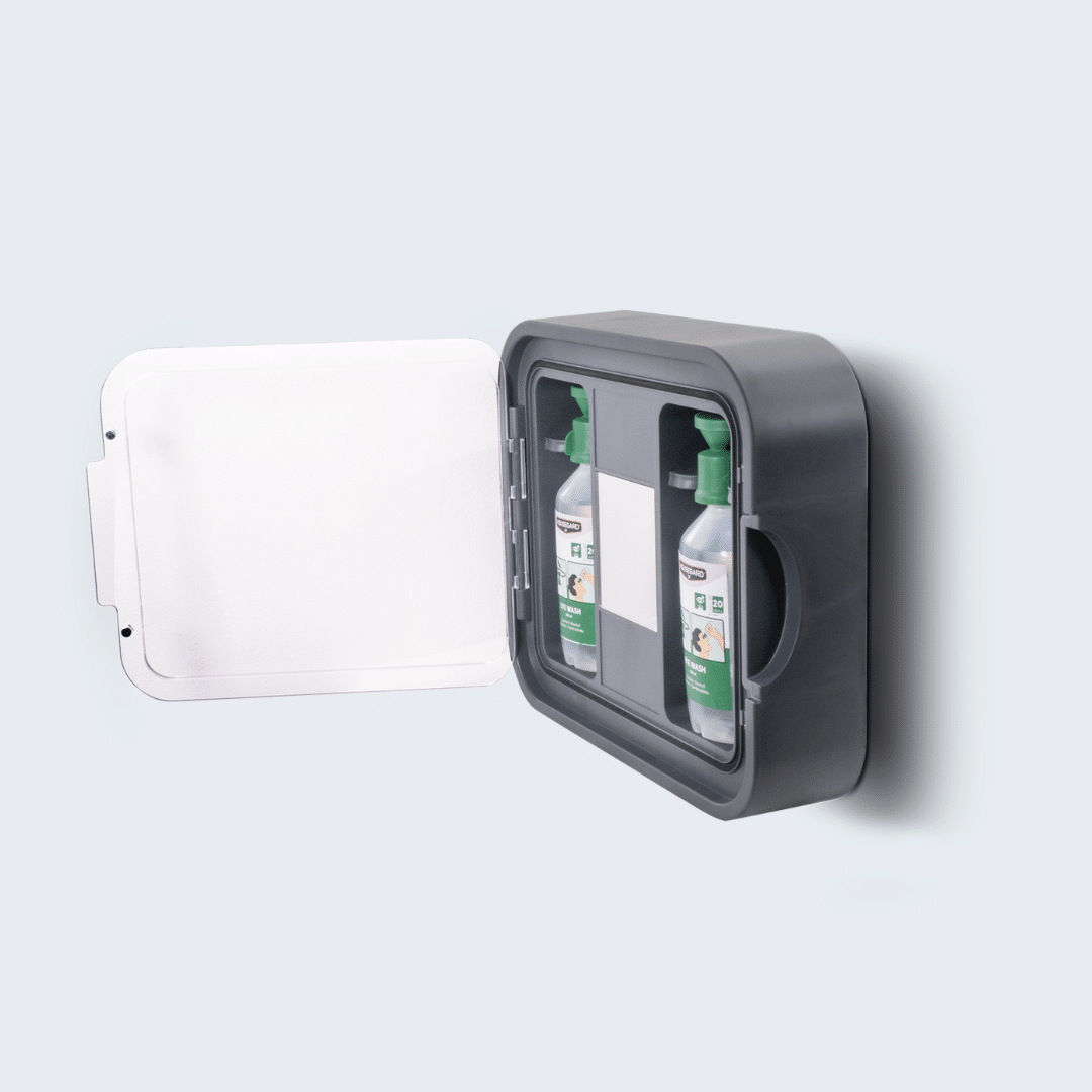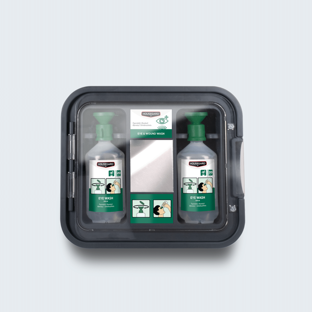 Praktisk øjenskylle-station til hurtig og effektiv skylning af øjne i miljøer med støv og partikler. Indeholder to flasker med steril 0,9 % NaCl og integreret spejl, der sikrer korrekt anvendelse. Den transparente låge beskytter indholdet og giver nem adgang i en nødsituation. Velegnet til arbejdspladser og skoler, hvor hurtig førstehjælp er afgørende.