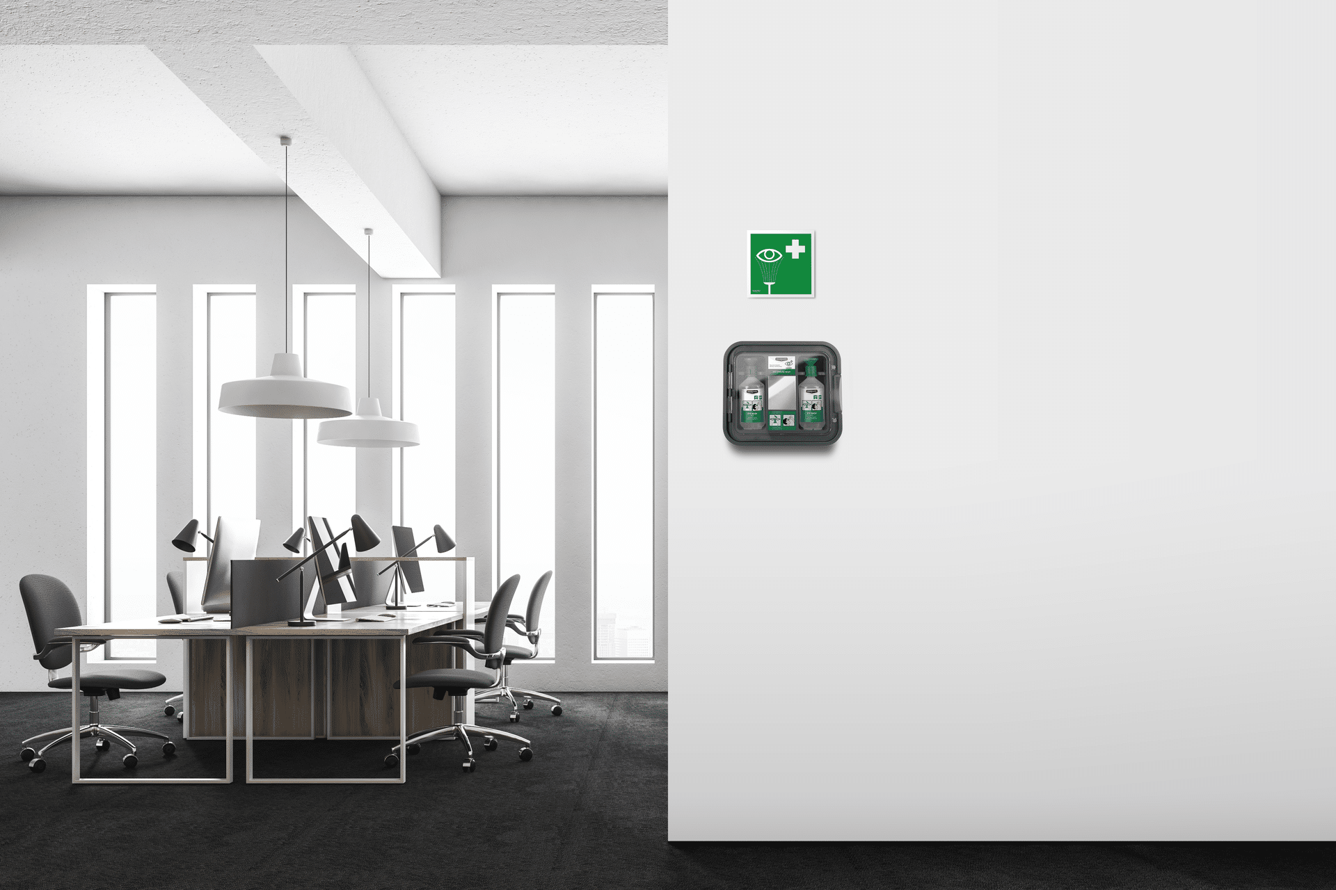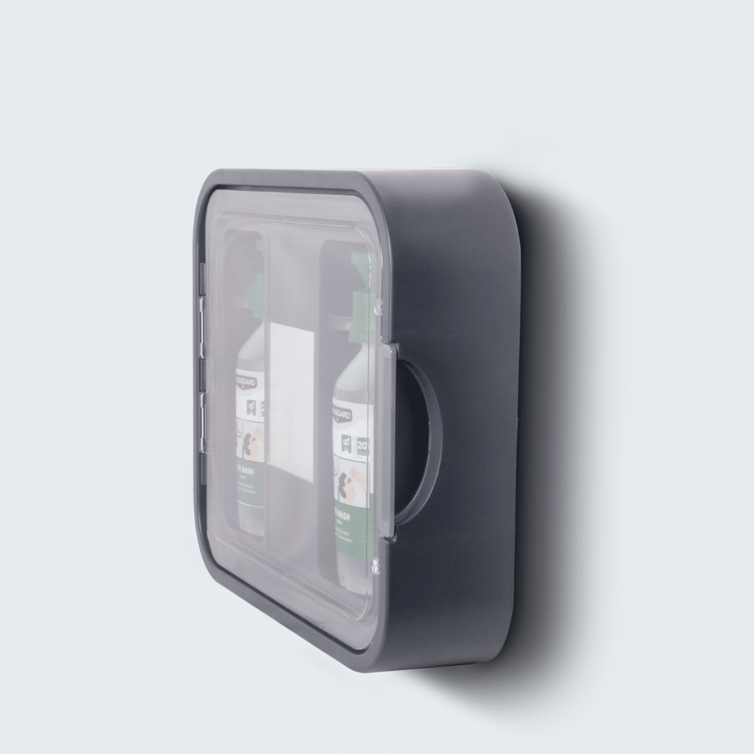Denne øjenskylle-station er udviklet til arbejdspladser, hvor der er risiko for, at fremmedlegemer kan ramme øjnene. Løsningen sikrer, at skylning kan igangsættes med det samme og giver samtidig en hygiejnisk og synlig opbevaring af flaskerne.